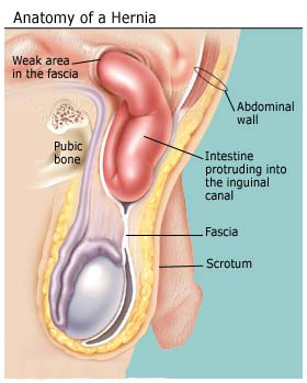 A hernia occurs when a portion of tissue in your body bulges into or penetrates a weakened muscle area. Most hernias occur when a piece of intestine slips through a weakness in the abdominal wall, creating a bulge you can see and feel. Hernias can develop around the navel, in the groin, or any place where you may have had a surgical incision. Some hernias are present at birth; others develop slowly over a period of months or years. Hernias can also come on quite suddenly.