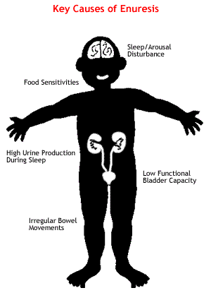 - Failure to arouse – the child does not wake up when the bladder is full or contracts spontaneously. In the majority of cases this is the primary cause, but one or both of the mechanisms listed below can also play a role.